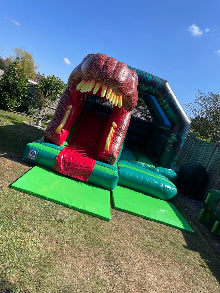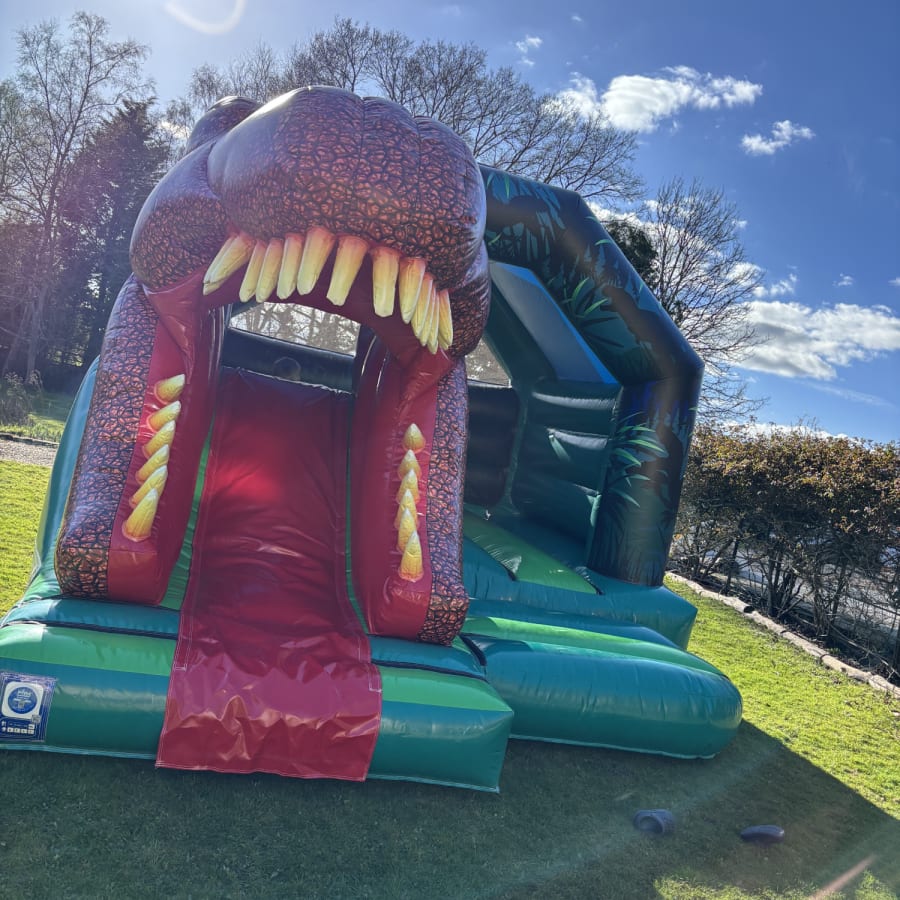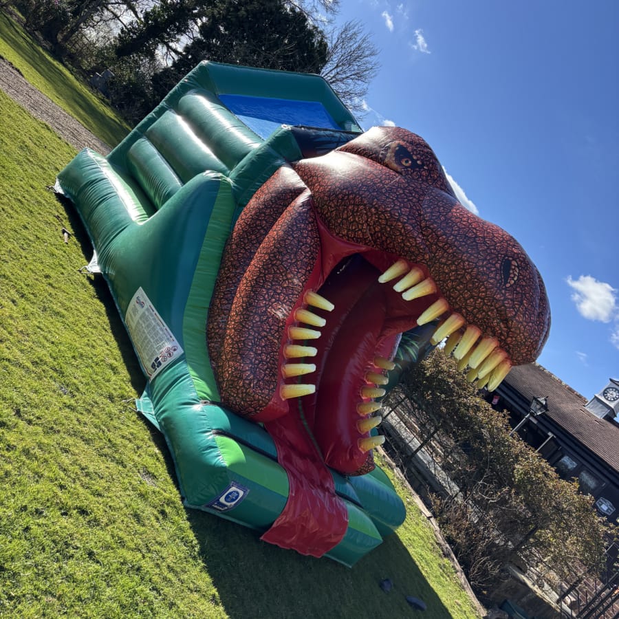 - Bounce & Slide Combo: Enjoy the best of both worlds with a spacious bouncy castle area and a thrilling front slide that plunges you out through the T-Rex’s jaws!